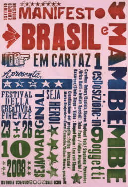 In 2008, the Istituto Europeo de Design was invited to organize an exhibition of Brazilian creation at the Festival della Creatività in Firenze, Italy -which included a condensed version of the exhibition ‘Brazil in poster’ presented the year before in Chaumont, France. Among the graphic works created by Rico Lins for the event are a typographical wheat-paste poster developed in the workshop with IED students at Graphic Fidalga and an offset folder with the schedule of activities.